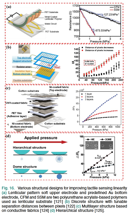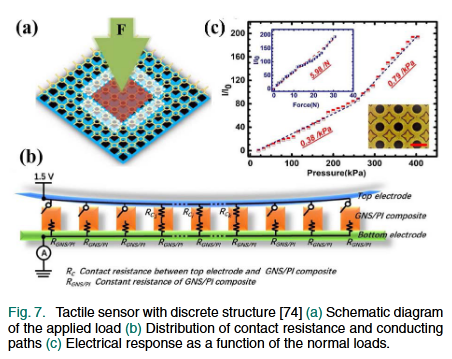 图 7:离散结构传感器(Liu 等人的设计)—— 上层金属网、中间石墨纳米片 / 聚酰亚胺电阻、下层电极,按压时金属网和电阻的接触面积扩大,并联的电阻变多,电阻变小 —— 它的动态范围特别宽(0-410kPa,既能测 15mg 的轻力,又能测重压力),低压灵敏度 0.38kPa⁻¹,高压 0.79kPa⁻¹;