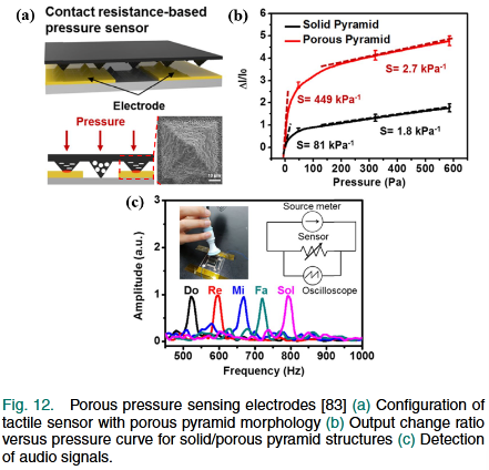 图 12:多孔金字塔 —— 在 PDMS 金字塔里掺聚苯乙烯颗粒,腐蚀掉后形成微孔(图 12a),表面镀聚吡咯,受压时微孔会变形,接触面积变化更大,灵敏度 449kPa⁻¹,还能检测音频信号(图 12c);