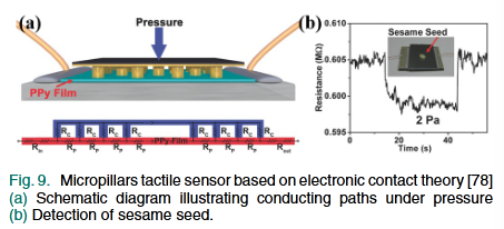 图 9:金镀层硅微柱传感器(图 9a)—— 微柱和软的聚吡咯膜接触,轻轻一压,微柱和膜的接触面积变大,电阻变小,能测到 2Pa 的力(相当于一片雪花的重量),还能检测芝麻粒(图 9b);