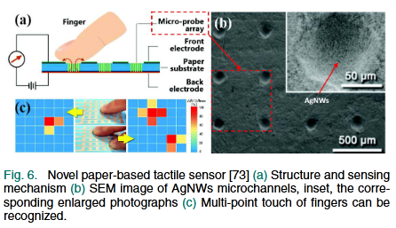 图 6:纸基传感器 —— 用硅微针在纸上扎孔,灌银纳米线溶液(图 6b 是孔里的银纳米线 SEM 图,能看到密密麻麻的纳米线),手指按的时候,接触的孔变多,总电阻变小,灵敏度 15k/N(很轻的力就能测到);