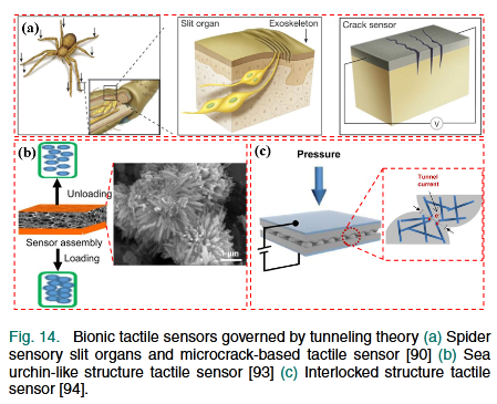 图 14a:模仿蜘蛛的裂纹传感器 —— 蜘蛛腿上有裂纹,能感知振动;科学家在柔性基板镀铂膜,预拉伸出纳米裂纹(图 14a 右边),受压时裂纹变窄,电子更容易跳过去,GF 值(应变灵敏度)高达 2000,是硅的几十倍,能测 5Pa 的力和位置;