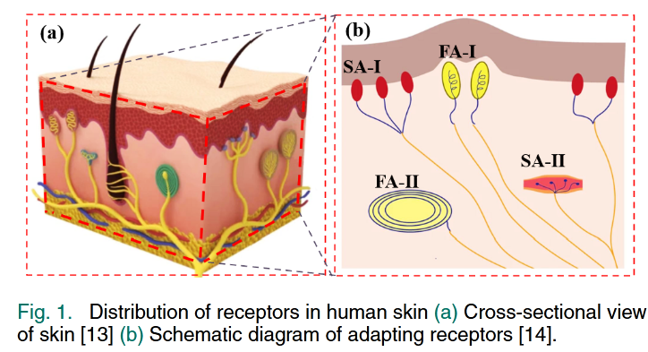 要做 “电子皮肤”,得先学人类皮肤怎么工作。文章说,人类皮肤有 4 种 “触觉感受器”,就像 4 种 “小传感器”,图 1 就是它们的样子: