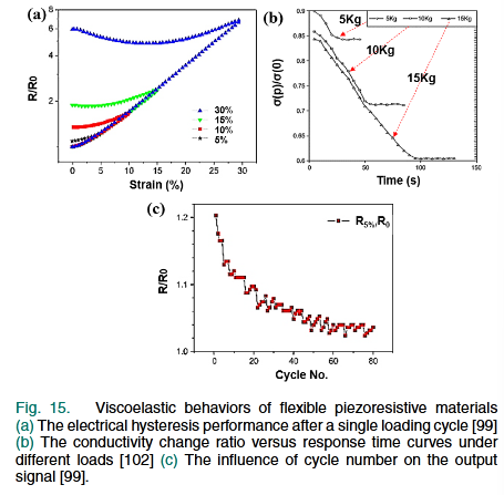 图 15b:负载越大,响应时间越长 —— 压 5kg 比压 15kg 的响应快,因为材料变形需要时间;