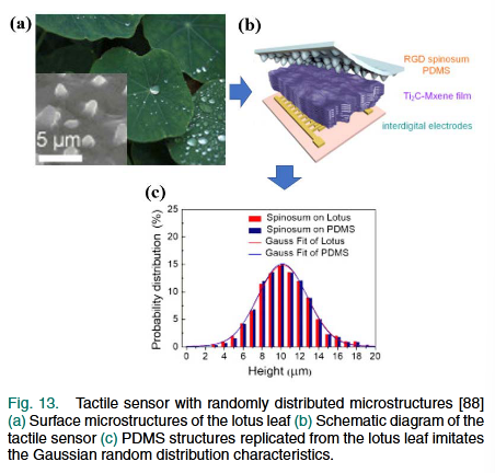 图 13:仿生随机结构 —— 模仿荷叶表面的随机凸起(图 13a),用 Ti3C2-MXene 膜(一种导电材料)和荷叶复制的 PDMS 层(图 13c,凸起高度随机),这种结构在宽压力范围都有高灵敏度:低压(0-5.75kPa)507kPa⁻¹,中压(5.75-12kPa)224kPa⁻¹,高压(12-40kPa)25kPa⁻¹—— 比整齐的金字塔好,因为整齐的凸起压到一定程度就贴满了,灵敏度会下降,而随机的能逐步接触。