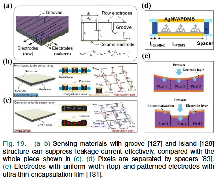 柔性传感器(比如 PDMS 做的)能贴在各种地方,但集成时容易有 “串扰”—— 比如按第 1 个像素,第 2、3 个像素的信号也会变,因为压力会扩散,或者电流会从旁边的像素流过来(图 18a)。