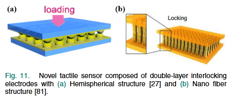 图 11:多层互锁结构 ——11a 是双层 PDMS 半球阵列(镀金属膜,上下颠倒互锁),按压时半球贴得更紧,灵敏度 12.8-196kPa⁻¹(0-100kPa);11b 是聚氨酯纤维镀铂,靠范德华力互锁,轻微压力就有很多重叠,信号大;