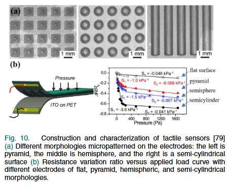 图 10:不同形貌的 PDMS(图 10a)—— 金字塔、半球、半圆柱,喷上碳纳米纤维后和 ITO 电极配对,测下来 “半圆柱” 的接触面积变化最大(图 10b 的曲线最陡),灵敏度 3.6kPa⁻¹;