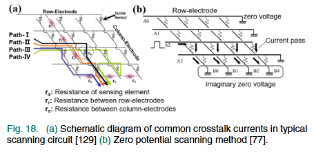 图 18a 是串扰的示意图:Path-I 是正常电流(按的像素),Path-II-IV 是串扰电流(从旁边的行、列电阻流过来),导致读数不准。