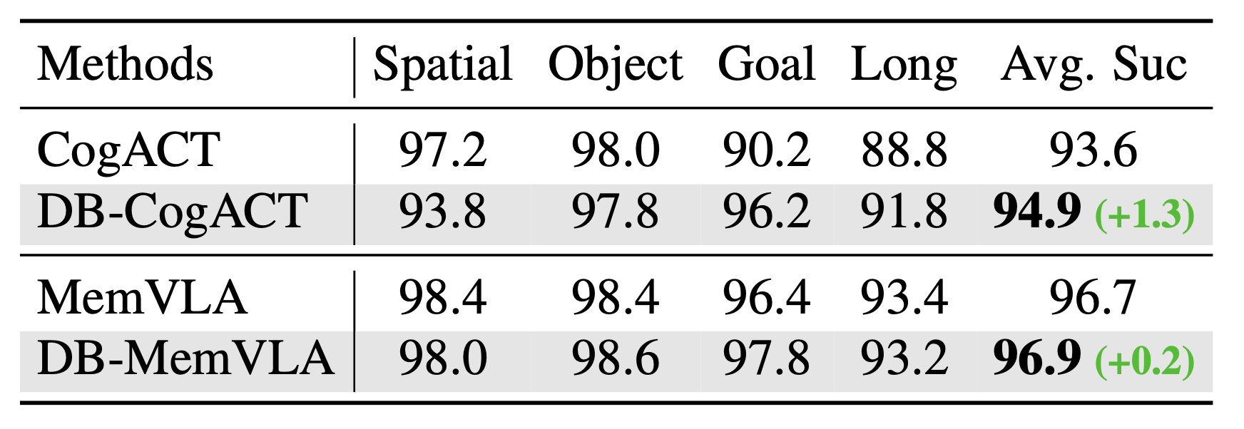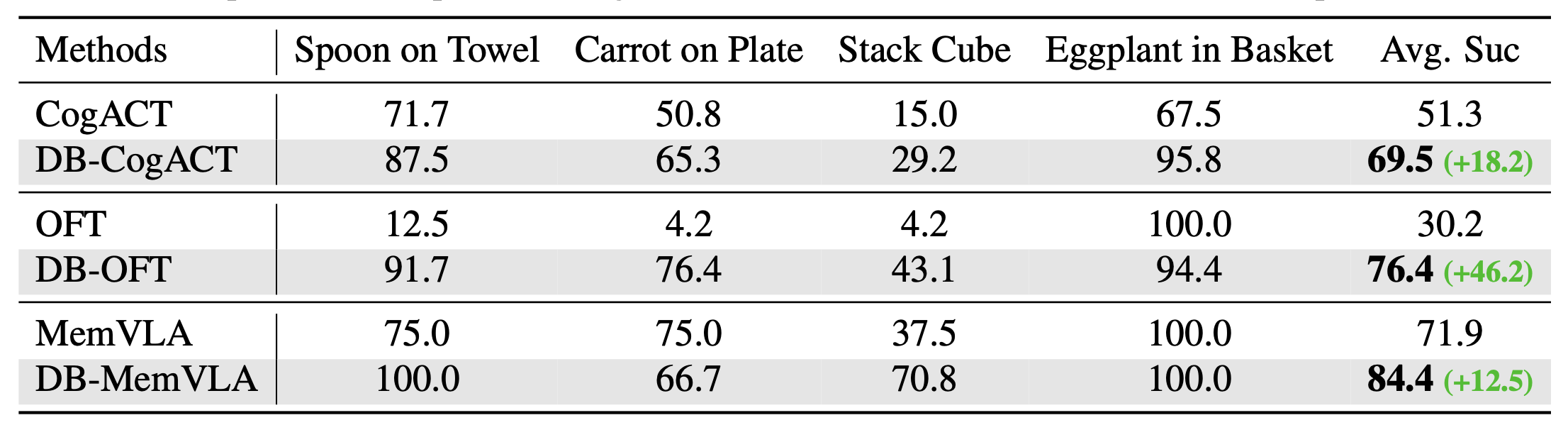 Libero基准包含四大任务套件,覆盖空间理解与目标导向行为等高阶能力。在该测试中,主流VLA策略性能已接近饱和。然而,引入 Dexbotic 预训练模型后,如 CogACT 与 MemoryVLA 等策略仍能实现性能突破,DB-CogACT 在四个任务套件上的平均成功率较基线提升 1.3%,体现出 Dexbotic 在成熟模型性能方面的优化潜力。