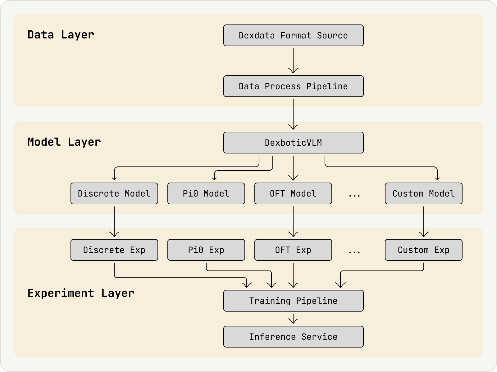 Dexbotic 的整体架构围绕三大层级展开,分别对应数据处理、模型构建与实验管理,形成闭环研发链路: