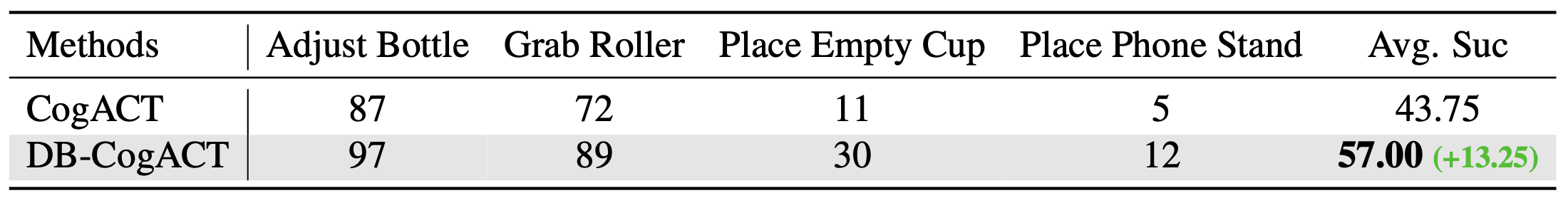 在涵盖50项双臂任务的 RoboTwin2.0 基准测试中,Dexbotic 同样表现优异。通过选取“调整瓶子”“抓取滚轮”“放置空杯”和“放置手机支架”四项任务进行对比,CogACT 的平均成功率为 43.75%,而 DB-CogACT 提升至 57.00%,绝对增益达 13%,进一步证明 Dexbotic 在复杂双臂操作中的有效性。