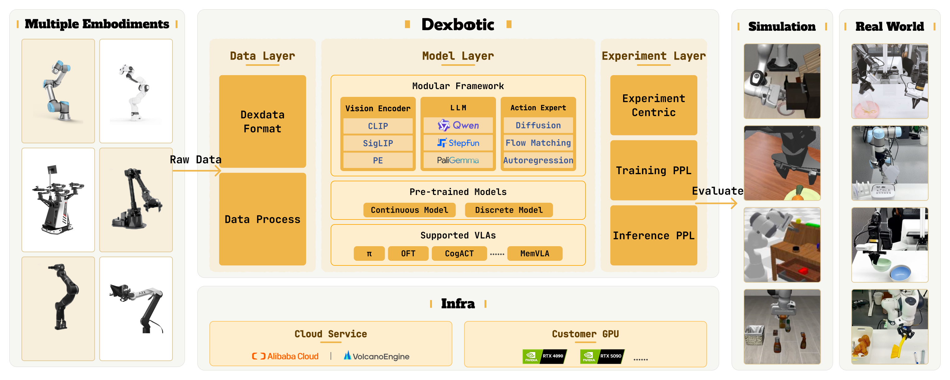 模型层以DexboticVLM基础模型为核心,支撑多样化VLA策略的开发。它既可直接用于离散VLA训练,也能作为现有策略的基座;当前已集成Pi0、OpenVLA-OFT等多种策略,并支持用户便捷地自定义新模型。