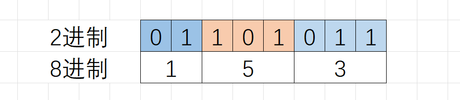然后是二进制到八进制和十六进制的转换。八进制的数字每⼀位是0~7的数字,各自写成二进制,最多有3个二进制位就足够了,比如7的二进制是111,所以在二进制转八进制数的时候,从二进制序列中右边低位开始向左每3个二进制位会换算一个八进制位,剩余不够3个二进制位的直接换算。比如说我们将二进制的01101011换算成八进制就是0153(0开头的数字,会被当做八进制)。