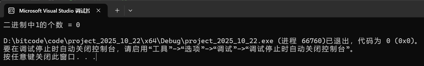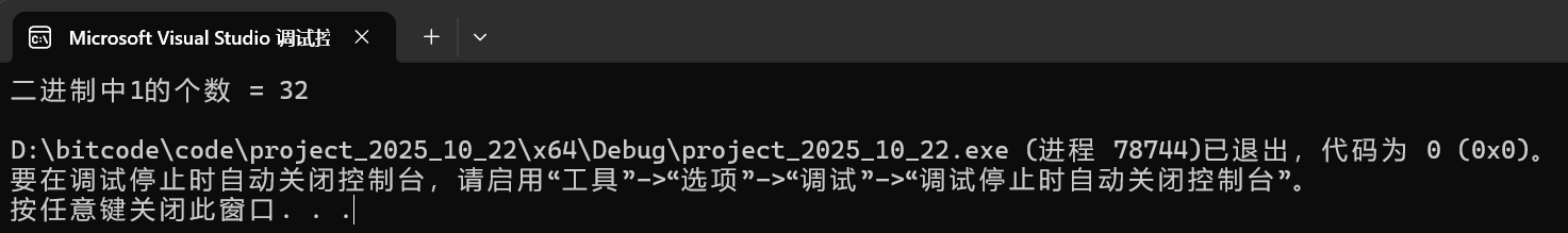 {unsigned int num = -1;int count= 0;//计数while(num){if(num%2 == 1)count++;num = num/2;}printf("⼆进制中1的个数 = %d\n", count);return 0;