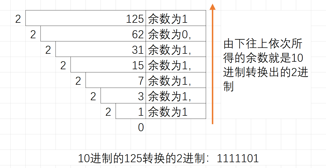 那么我们可以从二进制转为十进制,我们该如何从十进制转为二进制呢?很简单,就是我们上面这个过程的逆过程,具体如下图:
