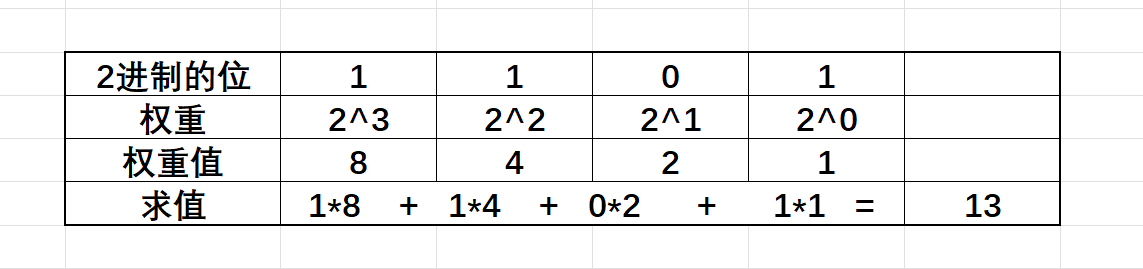 其实二进制和十进制是相似的,只不过是权重是2的0次方,2的1次方,2的2次方。如果是二进制的1101,我们该如何理解呢?你可以先自己算一下,然后和下面的图片对比一下: