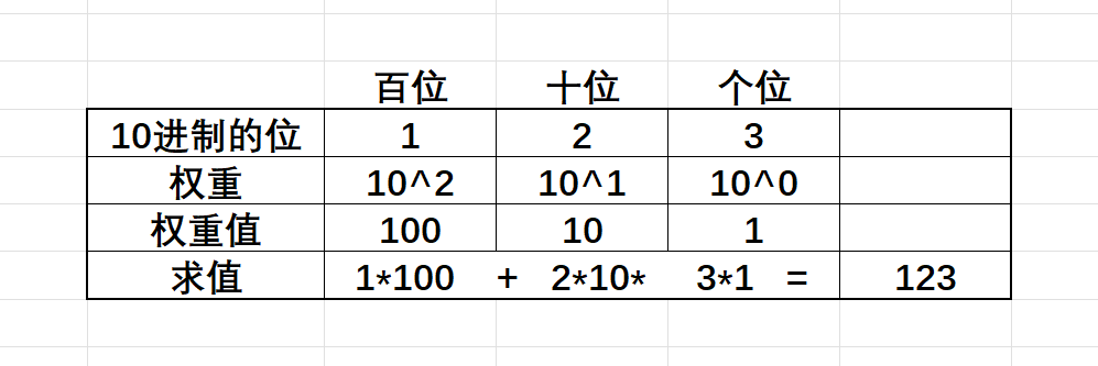 首先是二进制转十进制,我们如果用十进制来表示123的话,那他是怎么表示出来的呢。在十进制中,它的每一位都是有权重的,从个位、十位、百位.......,它们分别对应10的0次方,10的1次方,10的2次方......。那么123就是这么来的: