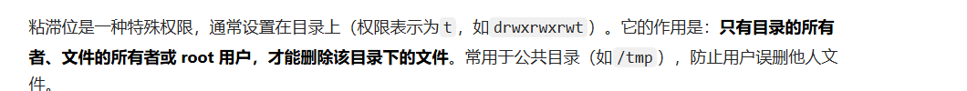 粘滞位是一种特殊的权限,通常设置在目录上,作用是只有目录的所有者和root用户可以删除该目录下的文件,防止用户误删他人的文件。