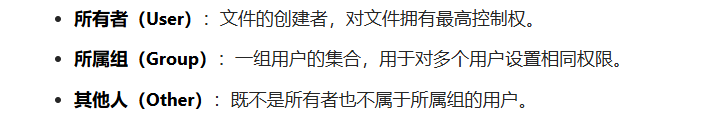 文件权限中的用户分类有三种,所有者,文件的创建者,对文件拥有最高权限。