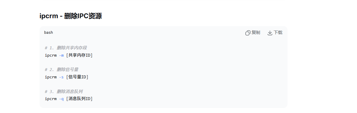 ipcsrm是删除,-m代表删除共享内存,信号量是-s,-q代表消息队列