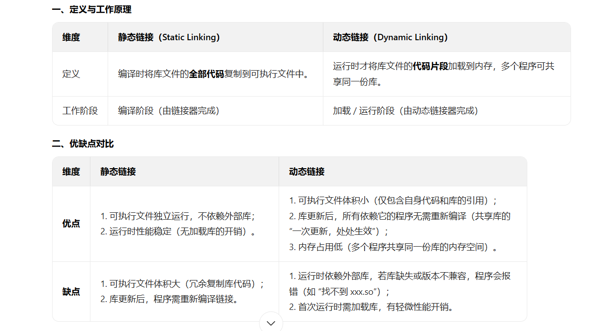 链接是重点,链接分为动态链接和静态链接, 静态链接是编译的时候把库文件的全部代码复制到可执行文件中,工作阶段是编译阶段,动态链接是运行的时候才将库文件的代码加载到内存中,多个程序可以共享内存的一个共同的库文件,工作阶段是加载、运行状态。