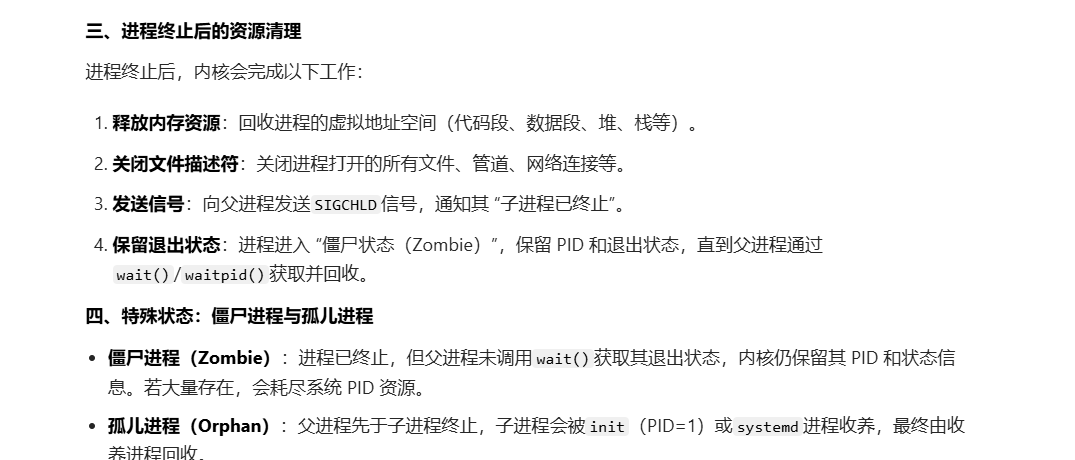 进程终止后内核会对进程释放内存资源,关闭文件描述符表,发送信号,通知它的父进程你的子进程终止了。保留退出状态。