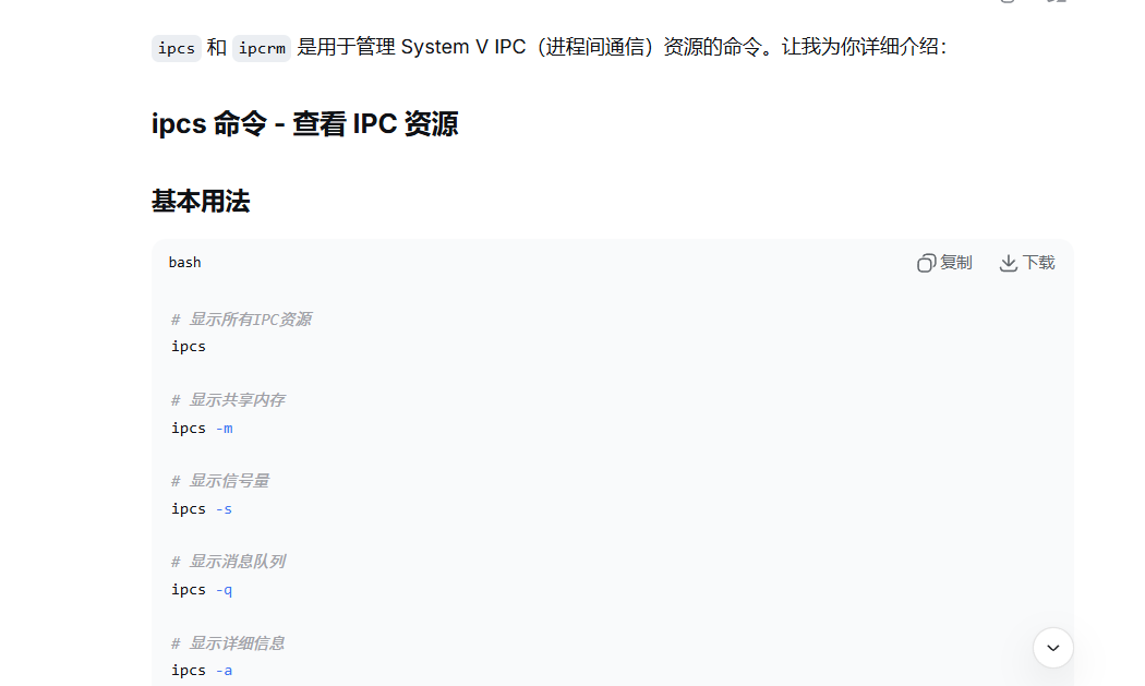 ipc指令是查看进程间通信的命令,ipcs是查看进程间通信-m查共享内存,-s查信号量,-q查消息队列,-a(all)代表详细的信息