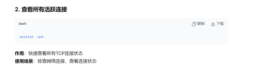 是一个功能强大的网络工具,用于显示网络连接、路由表、接口统计等信息,-t代表TCP,-u代表查UDP,-l代表监视端口,-p显示进程信息,-n数字格式信息。