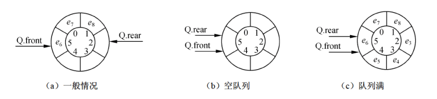 核心思路:把数组看成 “环形”(数组最后一个位置的下一个位置是第一个位置),用 “(rear+1)% 数组长度 == front” 判断队列是否满(不是看 rear 是否等于数组长度)。结构:和普通顺序队列一样(数组、front、rear),但指针移动时用 “取模” 实现环形。关键判断(必背!):