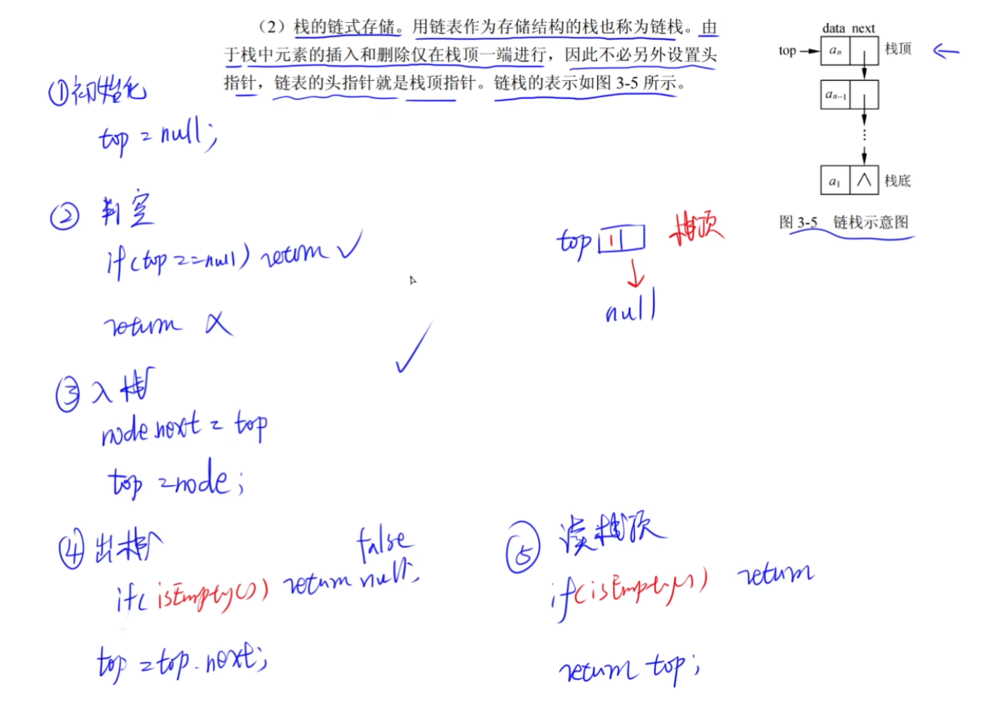 - 2. 链式栈(用链表实现,通常带头节点)结构:头节点的 next 指向栈顶节点(栈顶在链表的头部,不是尾部!因为链表尾部插元素要遍历,头部插更方便)。核心操作实现: