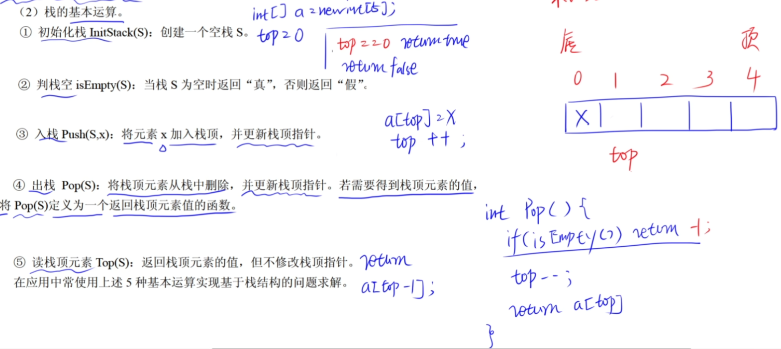 1. 顺序栈(用数组实现)结构:用数组存元素,加一个 “栈顶指针” top(记录栈顶元素的下标,初始时 top=-1,表示栈空)。核心操作实现(必懂!):