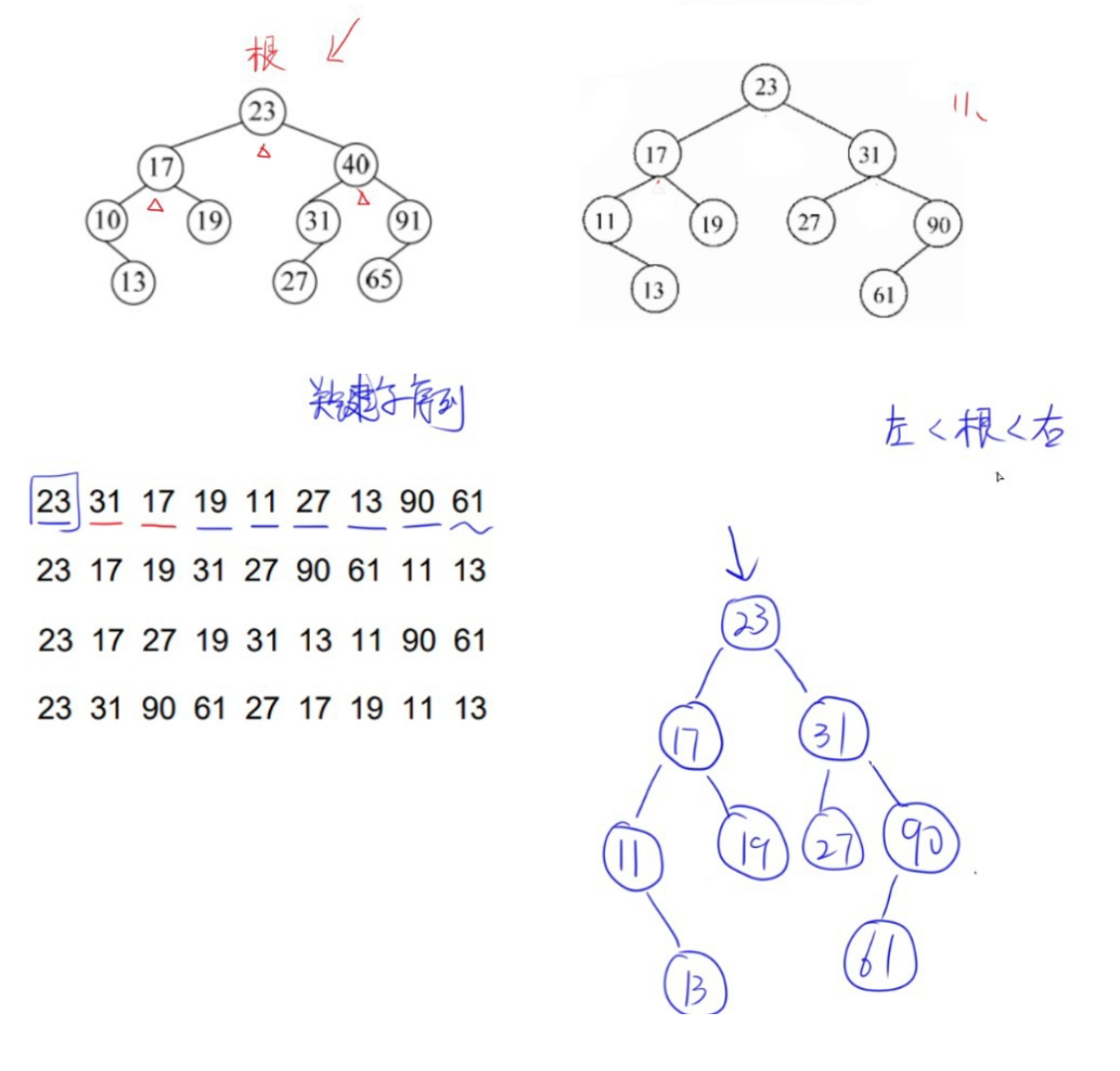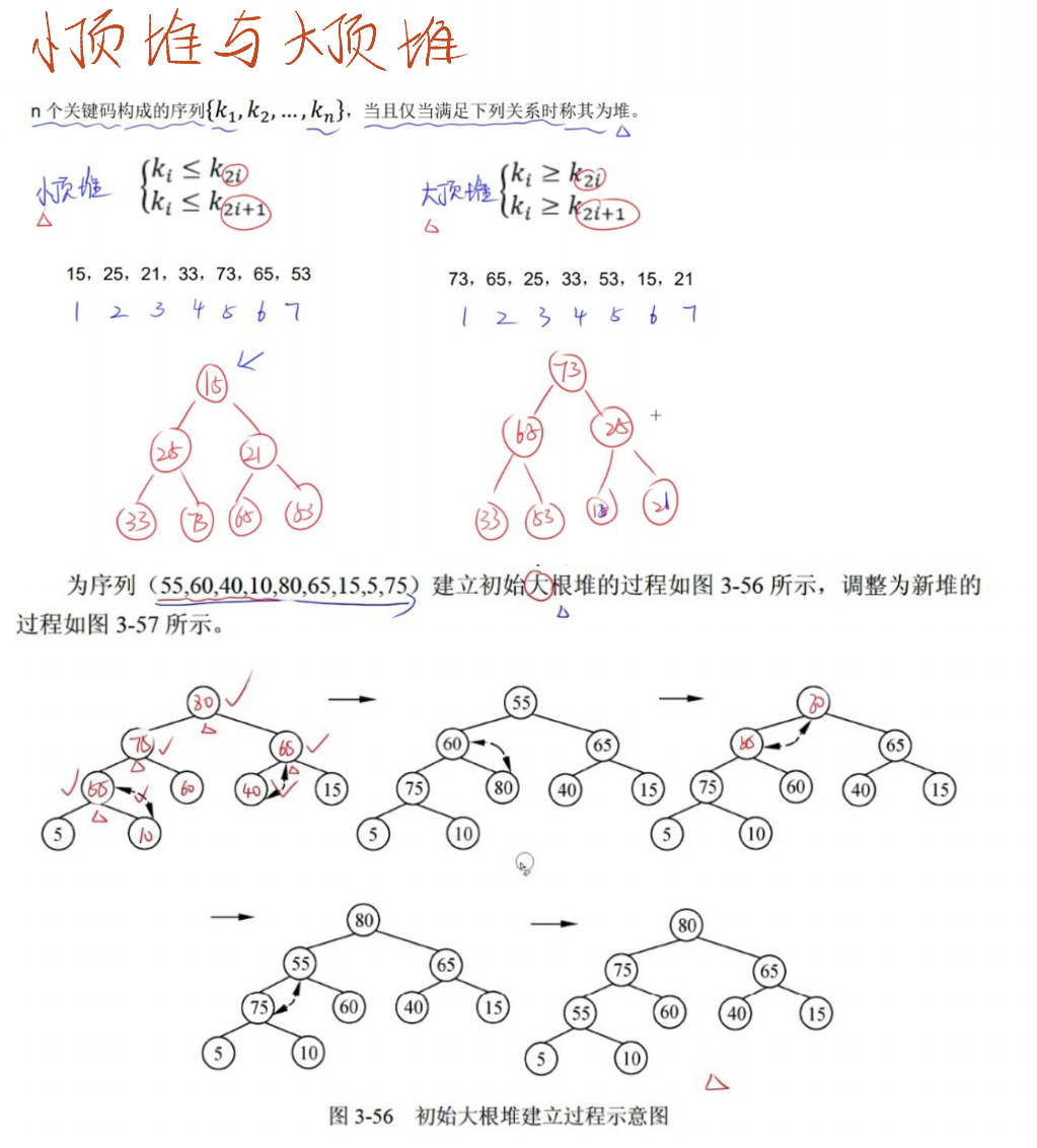 - 大根堆:每个父节点值≥子节点值(用于升序排序);