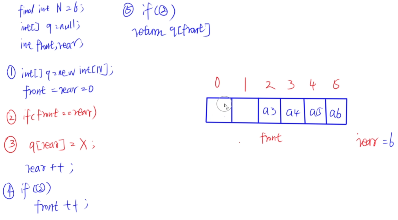 - 队满:(rear + 1) % maxSize == front(maxSize 是数组长度,这样会浪费一个数组位置,避免和队空的条件冲突)。核心操作实现(必懂!):