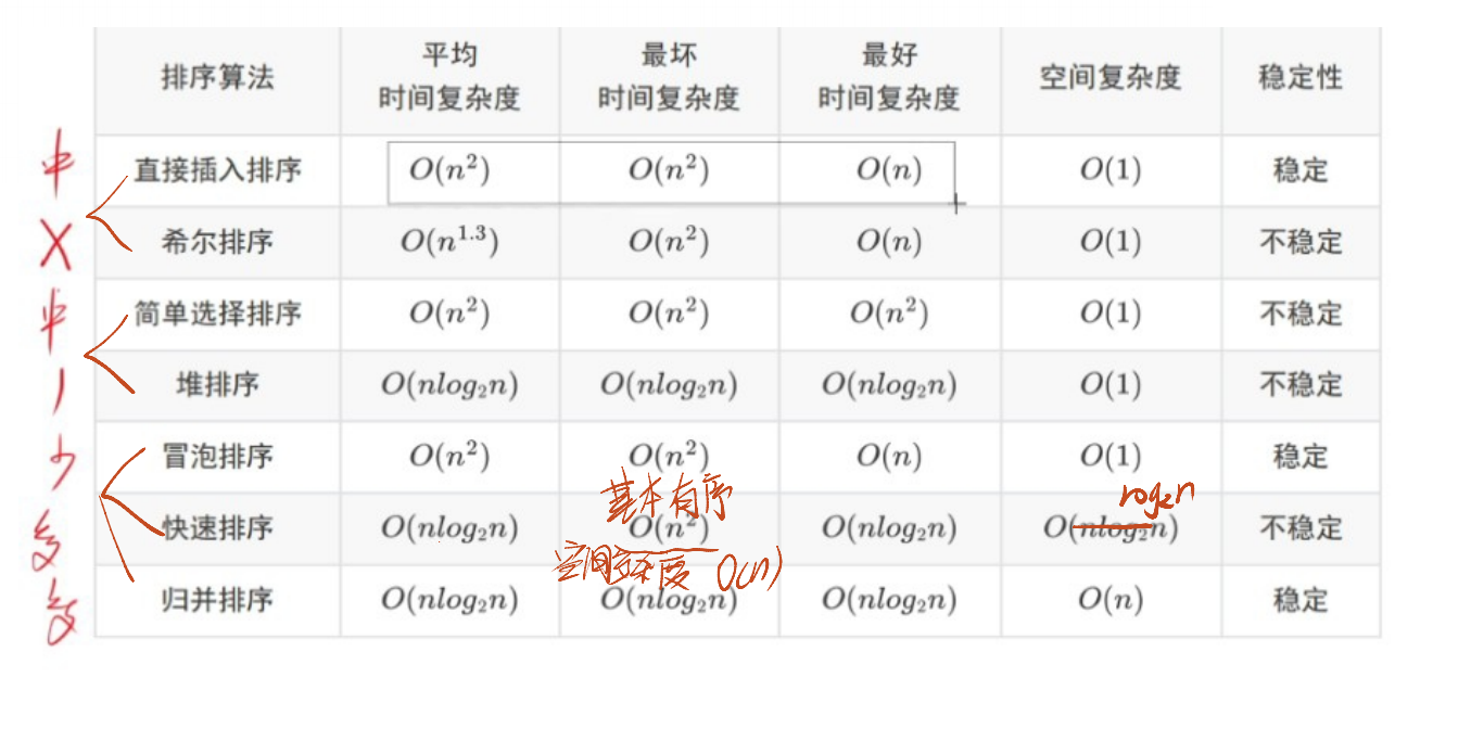 - 空间复杂度:算法所需额外存储空间,真题常考 “原地排序”(O (1),如堆排序)与 “非原地排序”(O (n),如归并排序)。