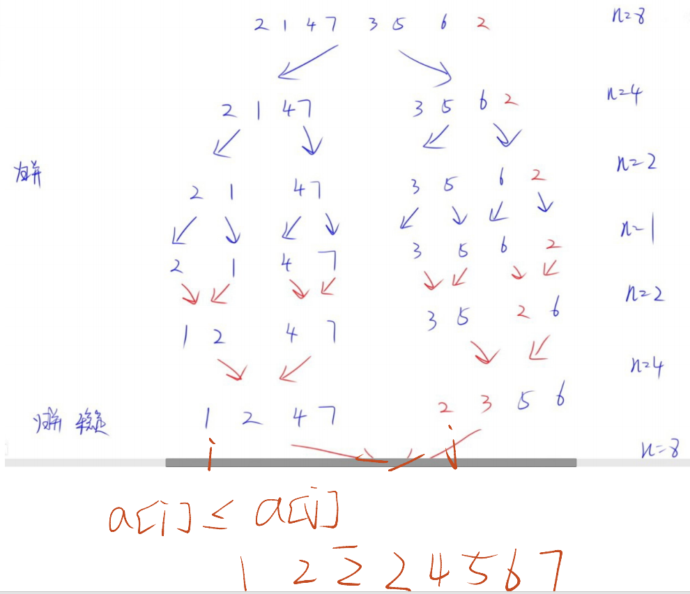 - 稳定性:稳定(合并时相等元素取左子数组的,相对位置不变);