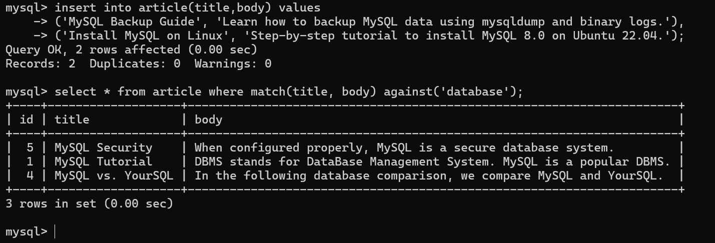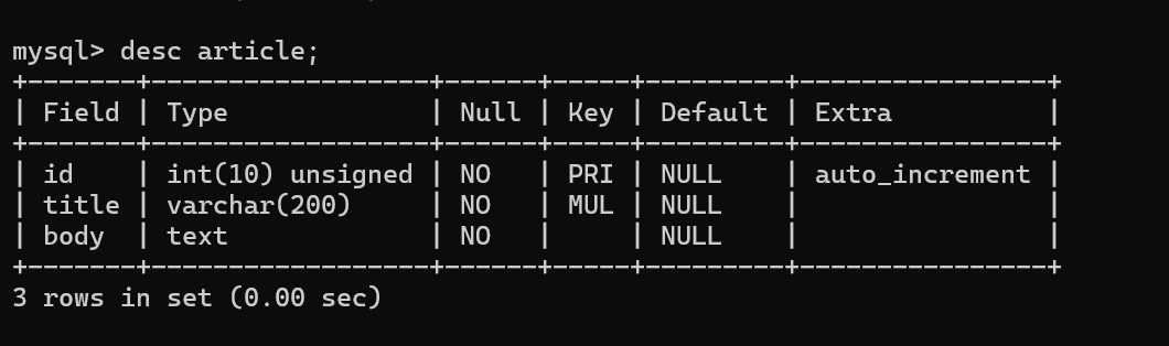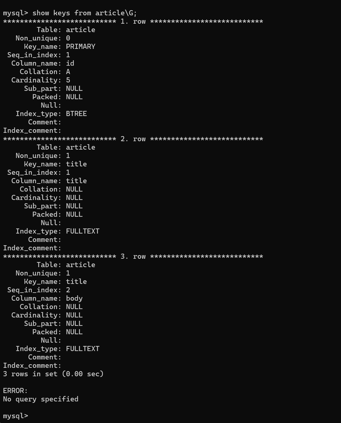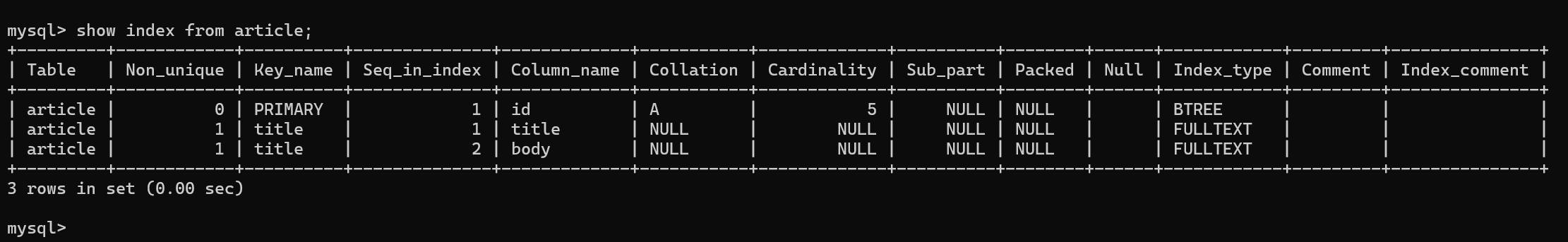create table article(id int unsigned auto_increment not null primary key, -- 自增主键title varchar(200) not null, body text not null, -- 文章内容(大量文字)fulltext(title, body)