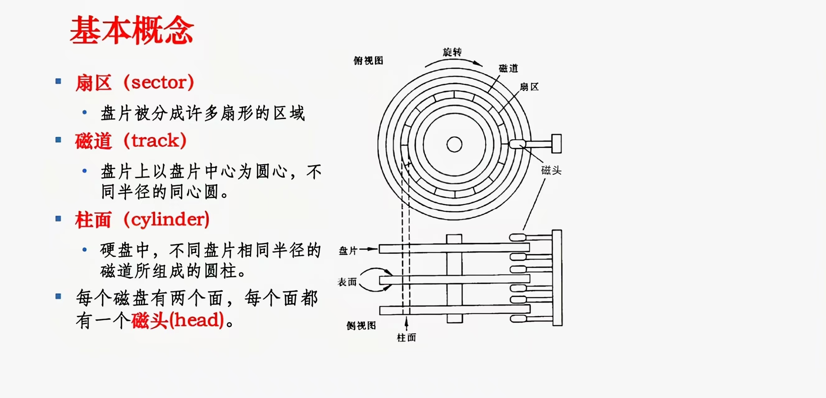 - 磁道与柱面:磁盘盘片表面有多个同心圆,每个同心圆称为 “磁道”;多盘磁盘中,所有盘片相同半径的磁道共同构成 “柱面”。