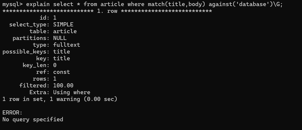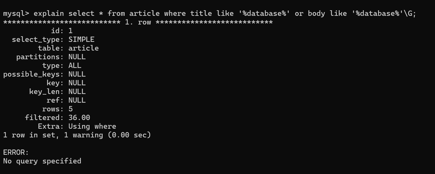 explain select * from article where title like '%database%' or body like '%database%'\G;