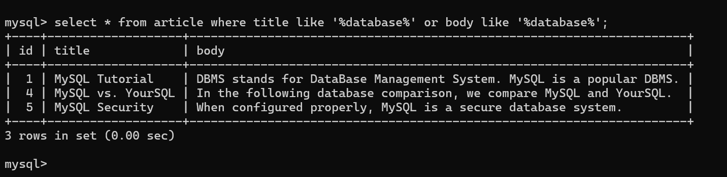 如果用 select * from article where title like '%database%' or body like '%database%'; 查询,虽能查询结果,