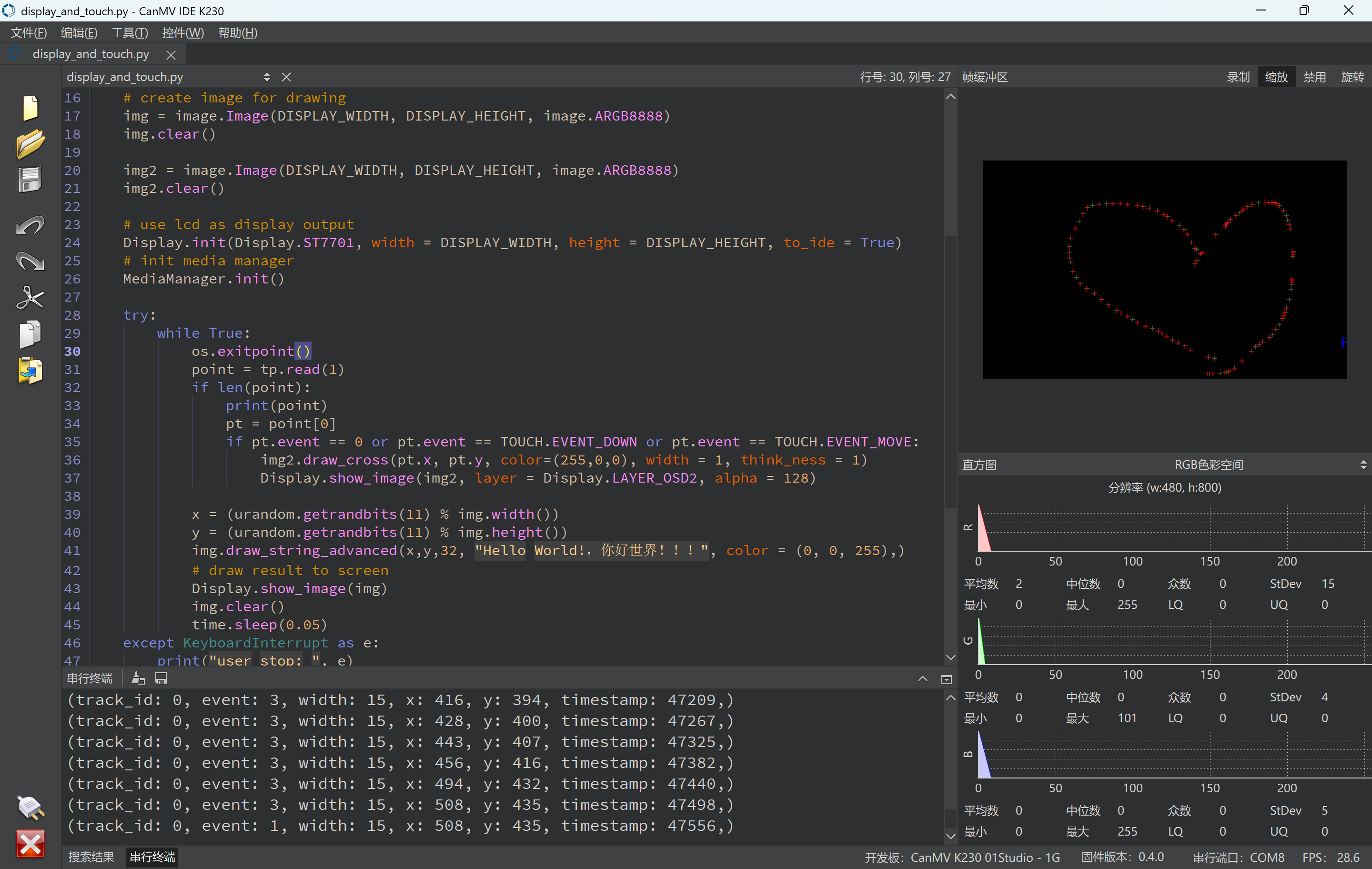 point = tp.read(1) # 读取触摸点数据 if len(point):pt = point[0]if pt.event == 0 or pt.event == TOUCH.EVENT_DOWN or pt.event == TOUCH.EVENT_MOVE:img2.draw_cross(pt.x, pt.y, color=(255,0,0), width=1, think_ness=1)Display.show_image(img2, layer=Display.LAYER_OSD2, alpha=128)
