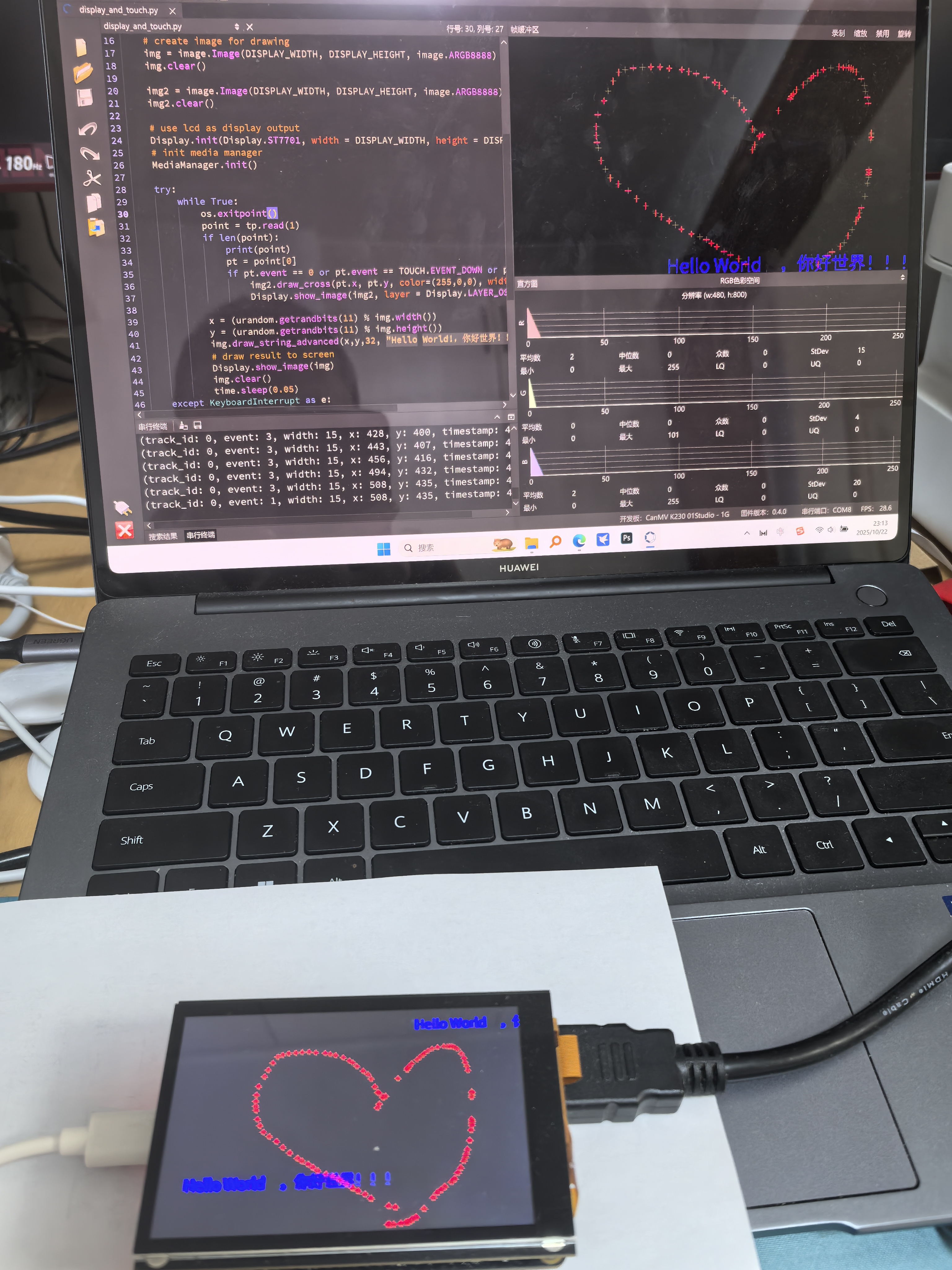 display_and_touch.py 为K230外接液晶显示屏与电容触摸屏功能演示程序,实现的效果为在屏幕上随机位置绘制“Hello World!,你好世界!!!”字符串,同时响应触摸事件,在触摸点绘制红色十字。