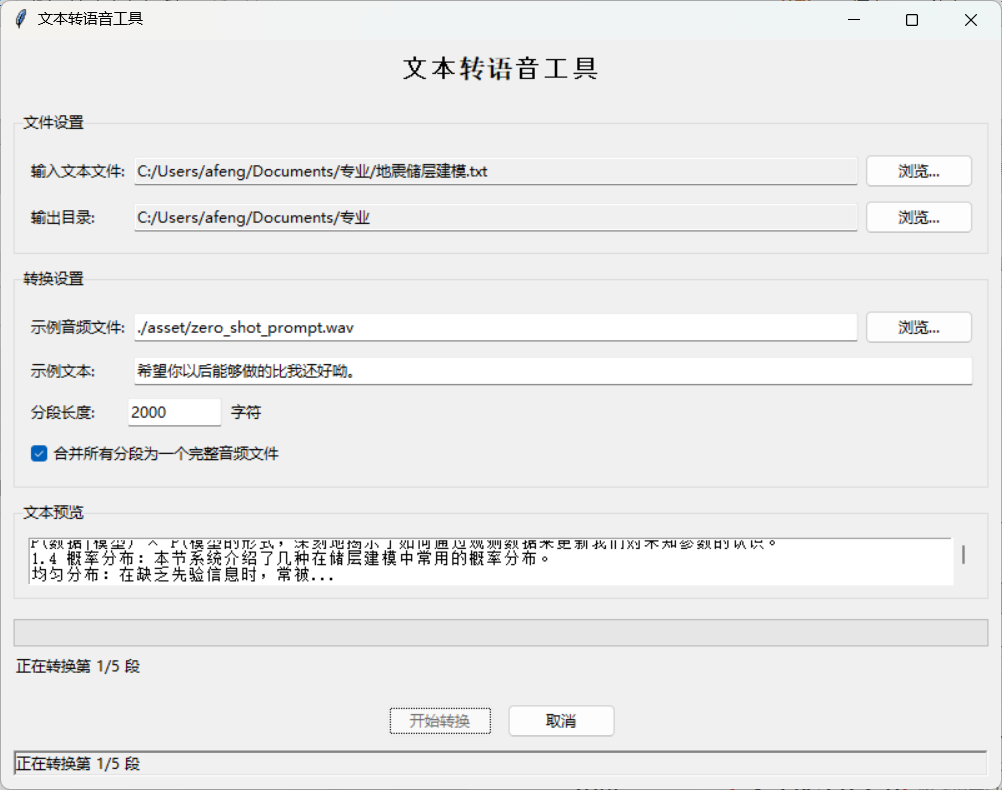 from cosyvoice.utils.file_utils import load_wavclass TextToSpeechApp:def __init__(self, root):self.root = rootself.root.title("文本转语音工具")self.root.geometry("800x600")self.root.resizable(True, True)# 模型变量self.cosyvoice = Noneself.prompt_speech_16k = None# 状态变量self.is_processing = Falseself.setup_ui()def setup_ui(self):"""设置用户界面"""# 主框架main_frame = ttk.Frame(self.root, padding="10")main_frame.grid(row=0, column=0, sticky=(tk.W, tk.E, tk.N, tk.S))# 配置网格权重self.root.columnconfigure(0, weight=1)self.root.rowconfigure(0, weight=1)main_frame.columnconfigure(1, weight=1)# 标题title_label = ttk.Label(main_frame, text="文本转语音工具", font=("Arial", 16, "bold"))title_label.grid(row=0, column=0, columnspan=3, pady=(0, 20))# 文件选择区域file_frame = ttk.LabelFrame(main_frame, text="文件设置", padding="10")file_frame.grid(row=1, column=0, columnspan=3, sticky=(tk.W, tk.E), pady=(0, 10))file_frame.columnconfigure(1, weight=1)# 输入文件选择ttk.Label(file_frame, text="输入文本文件:").grid(row=0, column=0, sticky=tk.W, pady=5)self.input_file_var = tk.StringVar()ttk.Entry(file_frame, textvariable=self.input_file_var, state="readonly").grid(row=0, column=1, sticky=(tk.W, tk.E), padx=(5, 5), pady=5)ttk.Button(file_frame, text="浏览...", command=self.select_input_file).grid(row=0, column=2, pady=5)# 输出目录选择ttk.Label(file_frame, text="输出目录:").grid(row=1, column=0, sticky=tk.W, pady=5)self.output_dir_var = tk.StringVar()ttk.Entry(file_frame, textvariable=self.output_dir_var, state="readonly").grid(row=1, column=1, sticky=(tk.W, tk.E), padx=(5, 5), pady=5)ttk.Button(file_frame, text="浏览...", command=self.select_output_dir).grid(row=1, column=2, pady=5)# 设置区域settings_frame = ttk.LabelFrame(main_frame, text="转换设置", padding="10")settings_frame.grid(row=2, column=0, columnspan=3, sticky=(tk.W, tk.E), pady=(0, 10))settings_frame.columnconfigure(1, weight=1)# 示例音频文件选择ttk.Label(settings_frame, text="示例音频文件:").grid(row=0, column=0, sticky=tk.W, pady=5)self.prompt_file_var = tk.StringVar(value="./asset/zero_shot_prompt.wav")ttk.Entry(settings_frame, textvariable=self.prompt_file_var).grid(row=0, column=1, sticky=(tk.W, tk.E), padx=(5, 5), pady=5)ttk.Button(settings_frame, text="浏览...", command=self.select_prompt_file).grid(row=0, column=2, pady=5)# 示例文本ttk.Label(settings_frame, text="示例文本:").grid(row=1, column=0, sticky=tk.W, pady=5)self.prompt_text_var = tk.StringVar(value="希望你以后能够做的比我还好呦。")ttk.Entry(settings_frame, textvariable=self.prompt_text_var).grid(row=1, column=1, columnspan=2, sticky=(tk.W, tk.E), padx=(5, 0), pady=5)# 文本分段长度ttk.Label(settings_frame, text="分段长度:").grid(row=2, column=0, sticky=tk.W, pady=5)self.chunk_size_var = tk.StringVar(value="2000")chunk_size_frame = ttk.Frame(settings_frame)chunk_size_frame.grid(row=2, column=1, columnspan=2, sticky=(tk.W, tk.E), pady=5)ttk.Entry(chunk_size_frame, textvariable=self.chunk_size_var, width=10).grid(row=0, column=0, sticky=tk.W)ttk.Label(chunk_size_frame, text="字符").grid(row=0, column=1, sticky=tk.W, padx=(5, 0))# 文本预览区域preview_frame = ttk.LabelFrame(main_frame, text="文本预览", padding="10")preview_frame.grid(row=3, column=0, columnspan=3, sticky=(tk.W, tk.E, tk.N, tk.S), pady=(0, 10))preview_frame.columnconfigure(0, weight=1)preview_frame.rowconfigure(0, weight=1)main_frame.rowconfigure(3, weight=1)# 文本预览文本框self.text_preview = tk.Text(preview_frame, height=10, wrap=tk.WORD)text_scrollbar = ttk.Scrollbar(preview_frame, orient="vertical", command=self.text_preview.yview)self.text_preview.configure(yscrollcommand=text_scrollbar.set)self.text_preview.grid(row=0, column=0, sticky=(tk.W, tk.E, tk.N, tk.S))text_scrollbar.grid(row=0, column=1, sticky=(tk.N, tk.S))# 进度区域progress_frame = ttk.Frame(main_frame)progress_frame.grid(row=4, column=0, columnspan=3, sticky=(tk.W, tk.E), pady=(0, 10))progress_frame.columnconfigure(0, weight=1)self.progress_var = tk.DoubleVar()self.progress_bar = ttk.Progressbar(progress_frame, variable=self.progress_var, maximum=100)self.progress_bar.grid(row=0, column=0, columnspan=2, sticky=(tk.W, tk.E), pady=5)self.progress_label = ttk.Label(progress_frame, text="就绪")self.progress_label.grid(row=1, column=0, columnspan=2, sticky=tk.W)# 按钮区域button_frame = ttk.Frame(main_frame)button_frame.grid(row=5, column=0, columnspan=3, pady=10)self.start_button = ttk.Button(button_frame, text="开始转换", command=self.start_conversion)self.start_button.grid(row=0, column=0, padx=(0, 10))self.cancel_button = ttk.Button(button_frame, text="取消", command=self.cancel_conversion, state="disabled")self.cancel_button.grid(row=0, column=1)# 状态栏self.status_var = tk.StringVar(value="就绪")status_bar = ttk.Label(main_frame, textvariable=self.status_var, relief=tk.SUNKEN)status_bar.grid(row=6, column=0, columnspan=3, sticky=(tk.W, tk.E))def select_input_file(self):"""选择输入文本文件"""file_path = filedialog.askopenfilename(title="选择文本文件",filetypes=[("文本文件", "*.txt"), ("所有文件", "*.*")])if file_path:self.input_file_var.set(file_path)self.load_text_preview(file_path)def select_output_dir(self):"""选择输出目录"""output_dir = filedialog.askdirectory(title="选择输出目录")if output_dir:self.output_dir_var.set(output_dir)def select_prompt_file(self):"""选择示例音频文件"""file_path = filedialog.askopenfilename(title="选择示例音频文件",filetypes=[("音频文件", "*.wav"), ("所有文件", "*.*")])if file_path:self.prompt_file_var.set(file_path)def load_text_preview(self, file_path):"""加载文本预览"""try:with open(file_path, 'r', encoding='utf-8') as f:content = f.read()# 只显示前1000个字符作为预览preview_content = content[:1000] + ("..." if len(content) > 1000 else "")self.text_preview.delete(1.0, tk.E