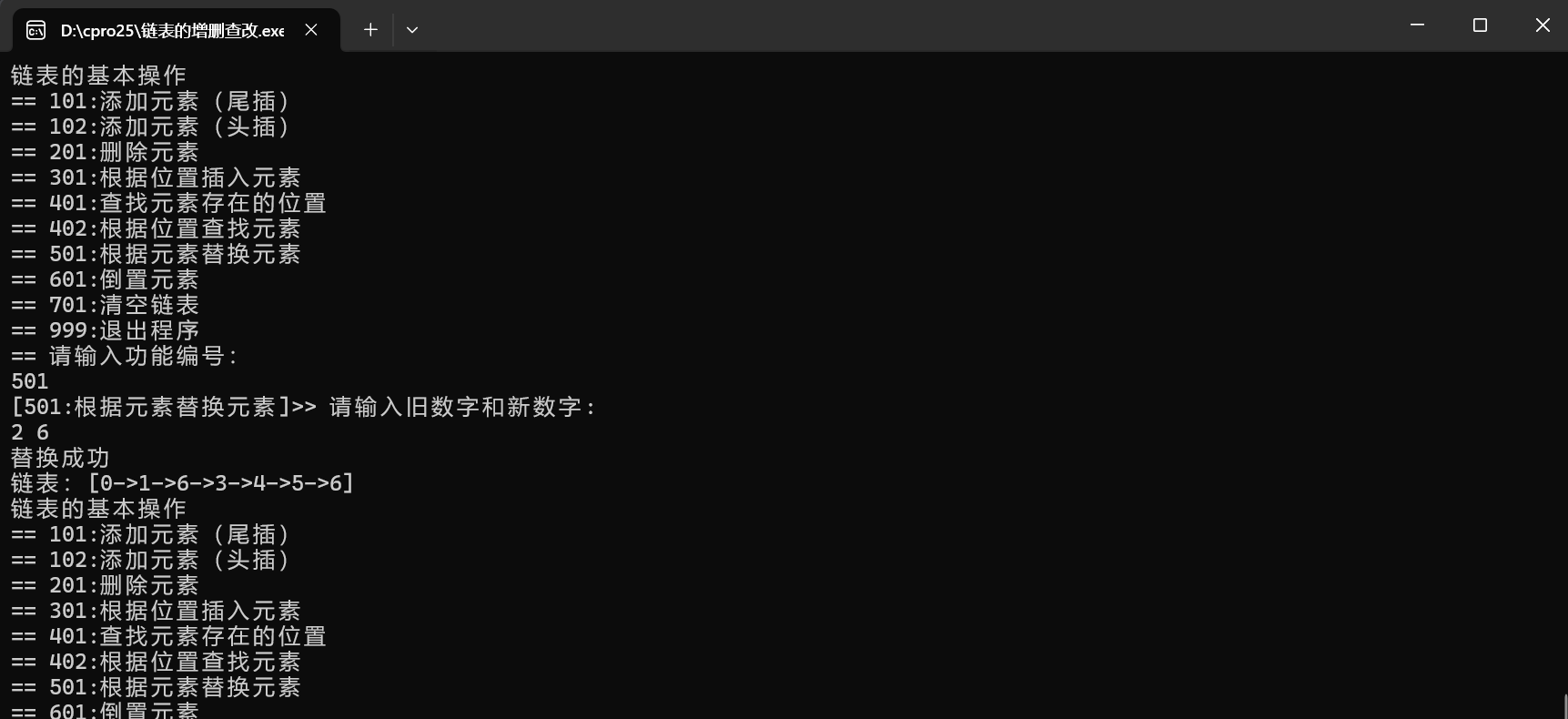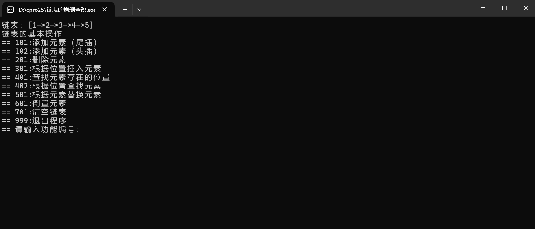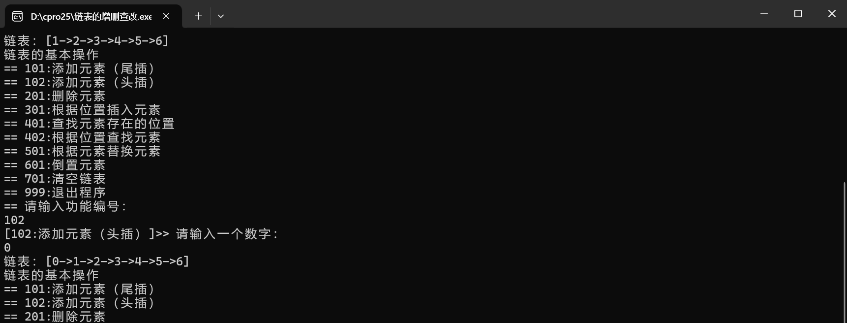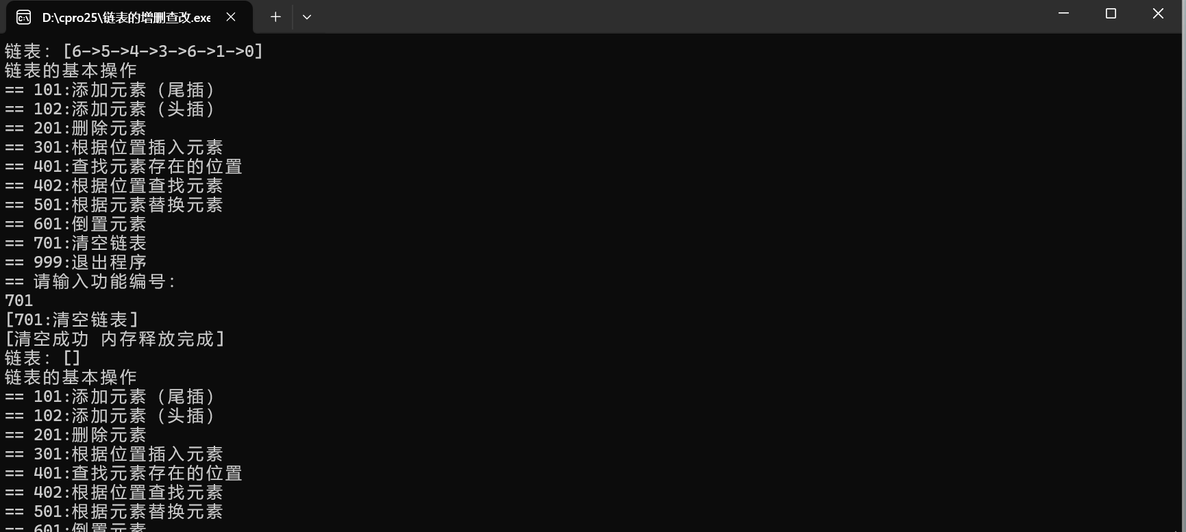 int main() {int cid = 0;// 头节点Node *head = NULL;// 初始链表head = add(1, head);head = add(2, head);head = add(3, head);head = add(4, head);head = add(5, head);printLinkedList(head);while (1) {printf("链表的基本操作\n");printf("== 101:添加元素(尾插)\n");printf("== 102:添加元素(头插)\n");printf("== 201:删除元素\n");printf("== 301:根据位置插入元素\n");printf("== 401:查找元素存在的位置\n");printf("== 402:根据位置查找元素\n");printf("== 501:根据元素替换元素\n");printf("== 601:倒置元素\n");printf("== 701:清空链表\n");printf("== 999:退出程序\n");printf("== 请输入功能编号:\n");scanf("%d", &cid);if (cid == 101) {printf("[101:添加元素(尾插)]>> 请输入一个数字:\n");int data = 0;scanf("%d", &data);head = add(data, head);} else if (cid == 102) {printf("[102:添加元素(头插)]>> 请输入一个数字:\n");int data = 0;scanf("%d", &data);head = addFirst(data, head);} else if (cid == 201) {printf("[201:删除元素]>> 请输入要删除的数字:\n");int data = 0;scanf("%d", &data);head = deleteByE(data, head);} else if (cid == 301) {printf("[301:根据位置插入元素]>> 请输入一个数字 和 一个位置下标: \n");int data = 0;int index;scanf("%d%d", &data, &index);head = insert(index, data, head);} else if (cid == 401) {printf("[401:查找元素存在的位置]>> 请输入一个数字: \n");int data = 0;scanf("%d", &data);int index = getByE(data, head);if (index == -1) {printf("数据不存在\n");} else {printf("%d在链表中的位置:%d\n", data, index);}} else if (cid == 402) {printf("[402:根据位置查找元素]>> 请输入位置下标: \n");int index;scanf("%d", &index);int val = getByIndex(index, head);if (val != -1) {printf("位置%d的元素是:%d\n", index, val);}} else if (cid == 501) {printf("[501:根据元素替换元素]>> 请输入旧数字和新数字: \n");int oldVal, newVal;scanf("%d%d", &oldVal, &newVal);replaceByE(oldVal, newVal, head);} else if (cid == 601) {printf("[601:倒置元素]\n");head = reverseList(head);} else if (cid == 701) {printf("[701:清空链表]\n");freeList(head);head = NULL;printf("[清空成功 内存释放完成] \n");} else if (cid == 999) {printf("退出程序,内存释放\n");freeList(head);exit(0);} else {printf("无效的功能编号\n");}printLinkedList(head);}
