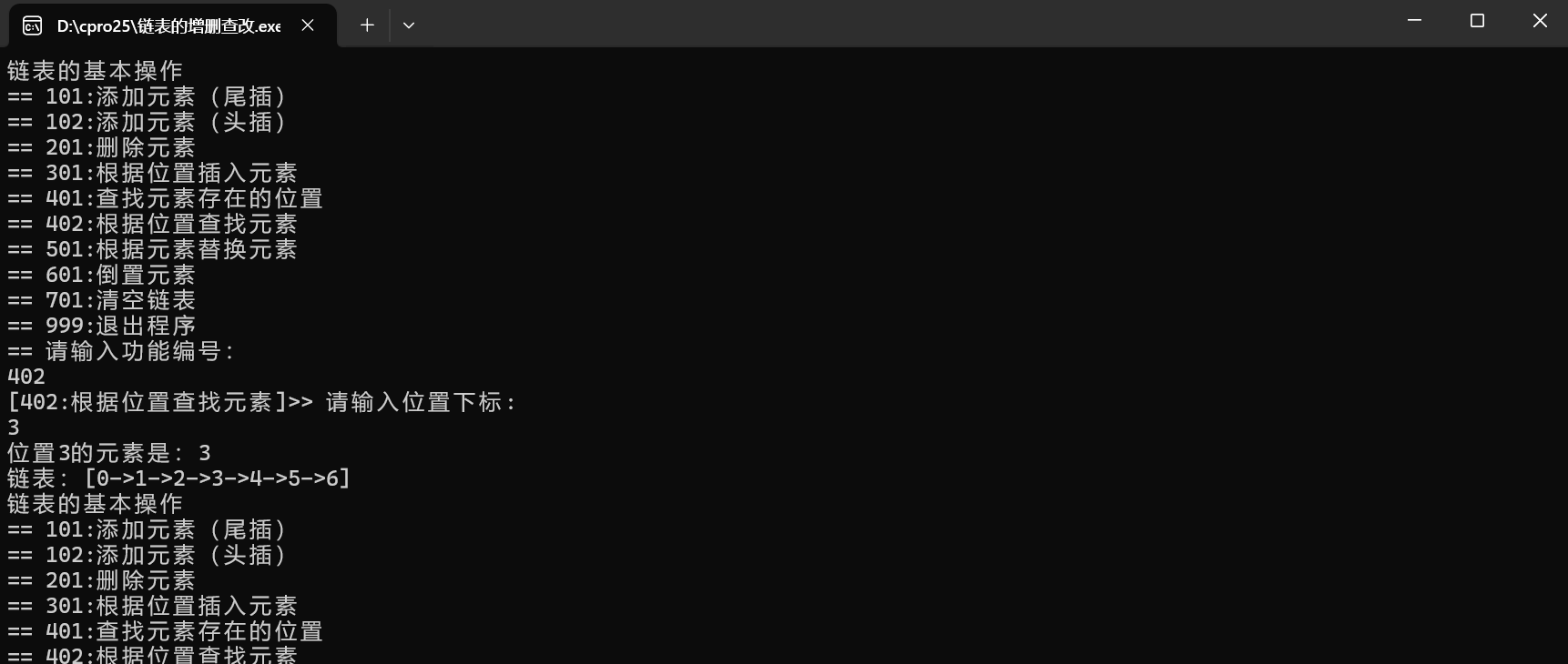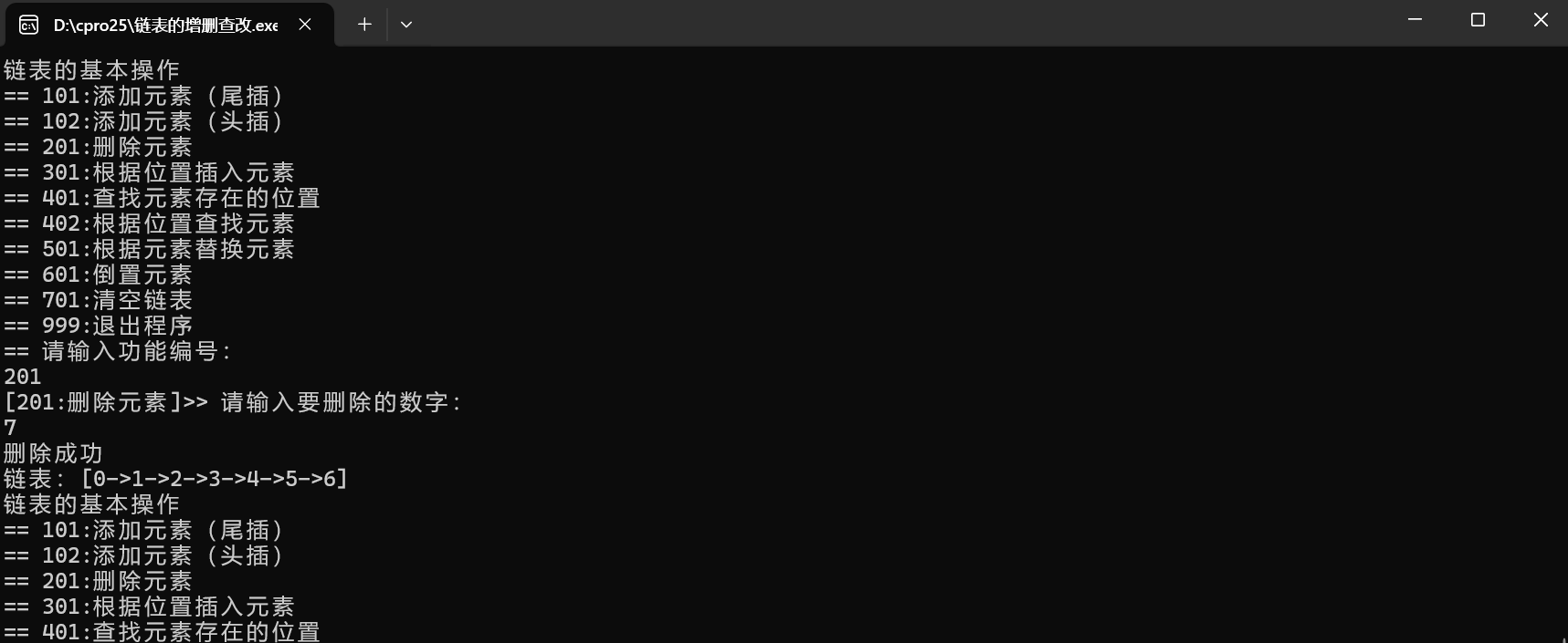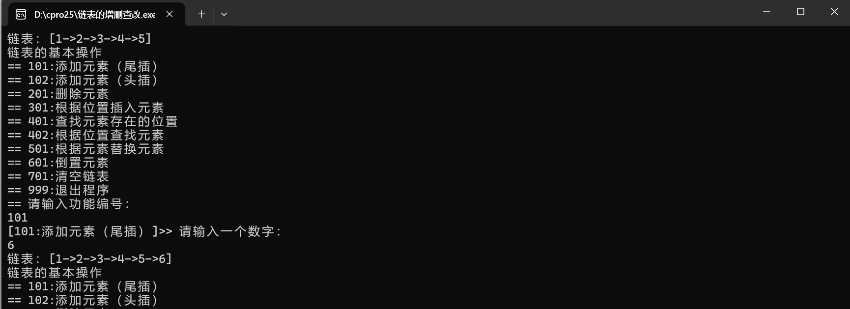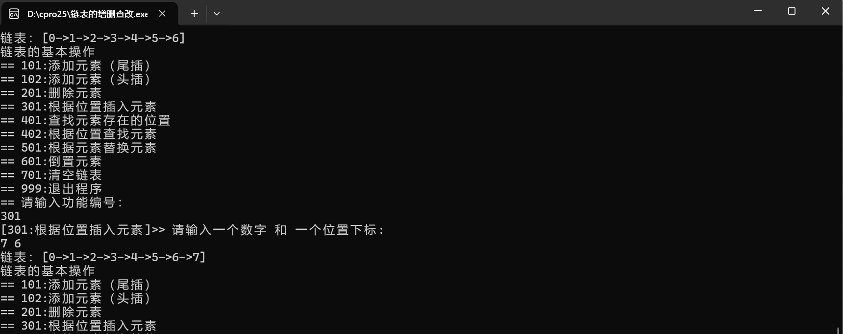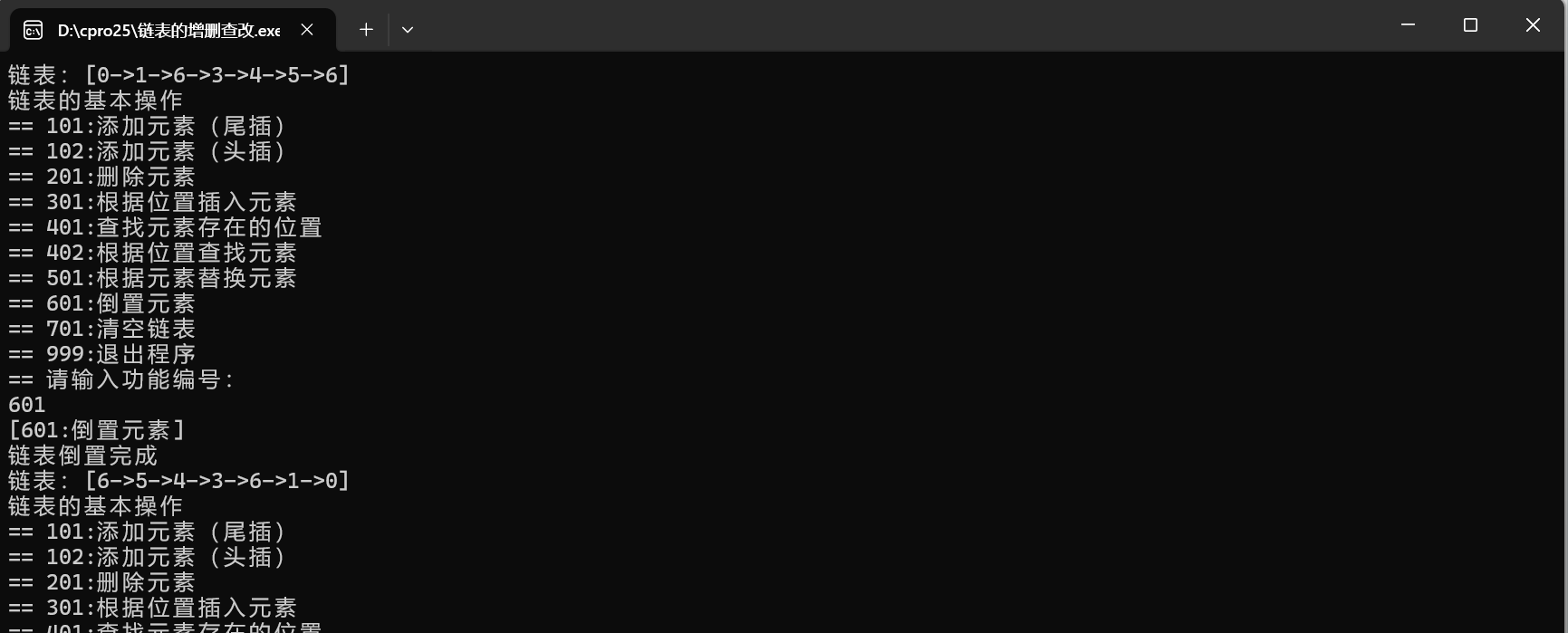 int main() {int cid = 0;// 头节点Node *head = NULL;// 初始链表head = add(1, head);head = add(2, head);head = add(3, head);head = add(4, head);head = add(5, head);printLinkedList(head);while (1) {printf("链表的基本操作\n");printf("== 101:添加元素(尾插)\n");printf("== 102:添加元素(头插)\n");printf("== 201:删除元素\n");printf("== 301:根据位置插入元素\n");printf("== 401:查找元素存在的位置\n");printf("== 402:根据位置查找元素\n");printf("== 501:根据元素替换元素\n");printf("== 601:倒置元素\n");printf("== 701:清空链表\n");printf("== 999:退出程序\n");printf("== 请输入功能编号:\n");scanf("%d", &cid);if (cid == 101) {printf("[101:添加元素(尾插)]>> 请输入一个数字:\n");int data = 0;scanf("%d", &data);head = add(data, head);} else if (cid == 102) {printf("[102:添加元素(头插)]>> 请输入一个数字:\n");int data = 0;scanf("%d", &data);head = addFirst(data, head);} else if (cid == 201) {printf("[201:删除元素]>> 请输入要删除的数字:\n");int data = 0;scanf("%d", &data);head = deleteByE(data, head);} else if (cid == 301) {printf("[301:根据位置插入元素]>> 请输入一个数字 和 一个位置下标: \n");int data = 0;int index;scanf("%d%d", &data, &index);head = insert(index, data, head);} else if (cid == 401) {printf("[401:查找元素存在的位置]>> 请输入一个数字: \n");int data = 0;scanf("%d", &data);int index = getByE(data, head);if (index == -1) {printf("数据不存在\n");} else {printf("%d在链表中的位置:%d\n", data, index);}} else if (cid == 402) {printf("[402:根据位置查找元素]>> 请输入位置下标: \n");int index;scanf("%d", &index);int val = getByIndex(index, head);if (val != -1) {printf("位置%d的元素是:%d\n", index, val);}} else if (cid == 501) {printf("[501:根据元素替换元素]>> 请输入旧数字和新数字: \n");int oldVal, newVal;scanf("%d%d", &oldVal, &newVal);replaceByE(oldVal, newVal, head);} else if (cid == 601) {printf("[601:倒置元素]\n");head = reverseList(head);} else if (cid == 701) {printf("[701:清空链表]\n");freeList(head);head = NULL;printf("[清空成功 内存释放完成] \n");} else if (cid == 999) {printf("退出程序,内存释放\n");freeList(head);exit(0);} else {printf("无效的功能编号\n");}printLinkedList(head);}