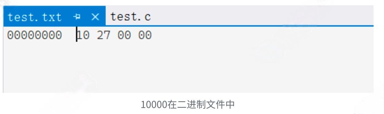 #include <stdio.h>int main(){int a = 10000;FILE* pf = fopen("test.txt", "wb");fwrite(&a, 4, 1, pf);fclose(pf);pf = NULL;return 0;}