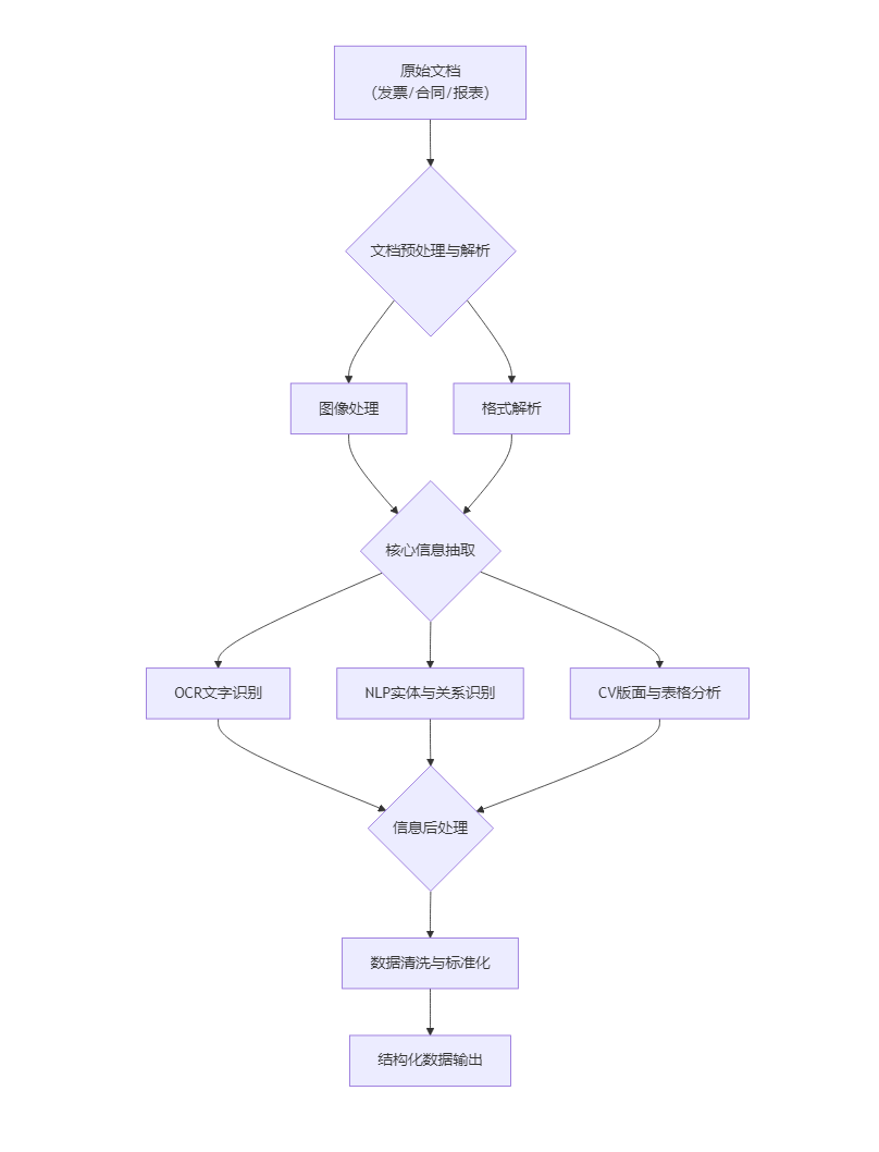 文档抽取技术是自然语言处理(NLP)和计算机视觉(CV)的一个交叉分支,其核心目标是从非结构化或半结构化的文档(如PDF、图片、扫描件)中,自动识别、定位并提取出特定的关键信息,并将其转化为计算机可以理解和处理的结构化数据。