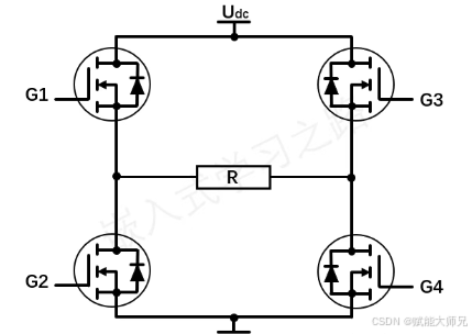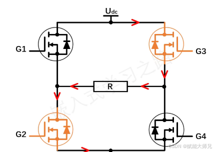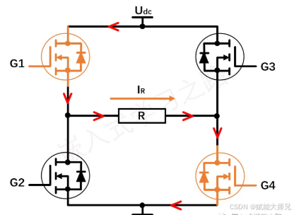 通过H桥不同MOS的导通可以切换流经负载R的电流方向,当G1和G4导通,G2和G3关断时,电流流向如图,假设记此时负载电压为正,则负载电压UR = +Udc。