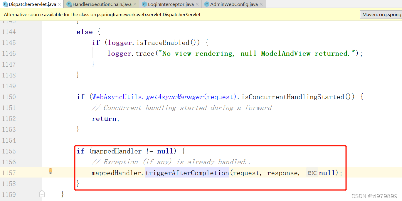 public class LoginInterceptor implements HandlerInterceptor {/*** 目标方法执行之前* @param request* @param response* @param handler* @return* @throws Exception*/@Overridepublic boolean preHandle(HttpServletRequest request,HttpServletResponse response,Object handler) throws Exception {String requestURI = request.getRequestURI();log.info("preHandle拦截的请求路径是{}",requestURI);//登录检查逻辑HttpSession session = request.getSession();Object loginUser = session.getAttribute("loginUser");if(loginUser != null){//放行return true;}//拦截未登录。跳转到登录页request.setAttribute("msg","请先登录");//重定向或者转发到登录页//re.sendRedirect("/");request.getRequestDispatcher("/").forward(request,response);return false;}/*** 目标方法执行完成以后* @param request* @param response* @param handler* @param modelAndView* @throws Exception*/@Overridepublic void postHandle(HttpServletRequest request,HttpServletResponse response,Object handler,ModelAndView modelAndView) throws Exception {log.info("postHandle执行{}",modelAndView);}/*** 页面渲染以后* @param request* @param response* @param handler* @param ex* @throws Exception*/@Overridepublic void afterCompletion(HttpServletRequest request,HttpServletResponse response,Object handler, Exception ex) throws Exception {log.info("afterCompletion执行异常{}",ex);}