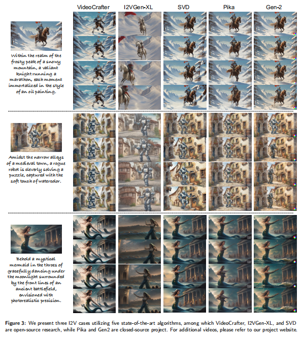 为更直观展示算法差异,论文选取 3 个典型场景(骑士在雪山马拉松、机器人在中世纪小镇解谜、美人鱼在古战场跳舞),对比了 5 个算法的生成效果,结果如图 3 所示。