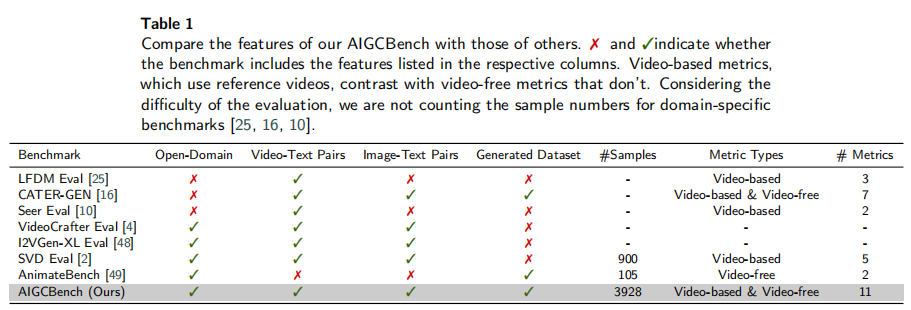 - AIGCBench 是唯一同时满足 “开放域”“包含视频 - 文本对 / 图像 - 文本对”“人工生成数据集”“大样本量(3928)” 的基准;